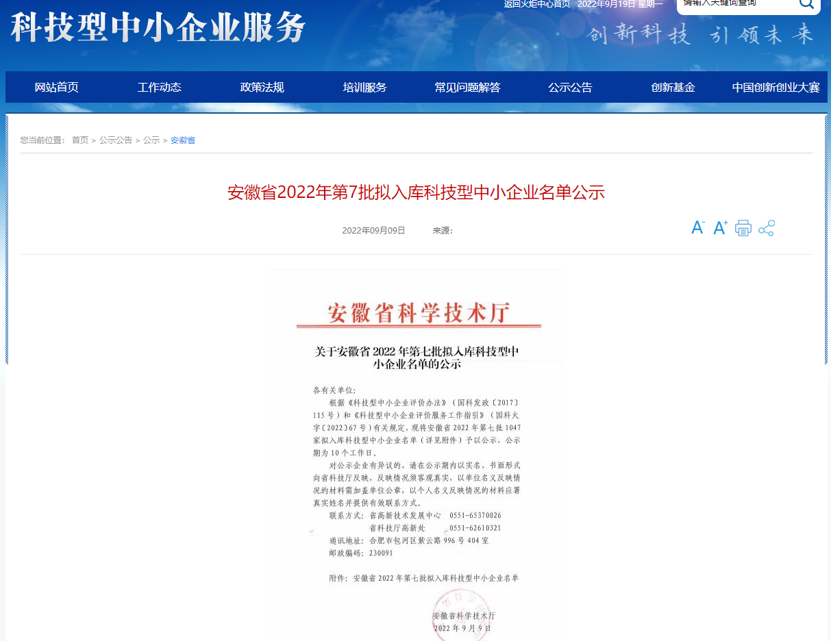 公司榮獲安徽省2022年第七批擬入庫科技型中小企業