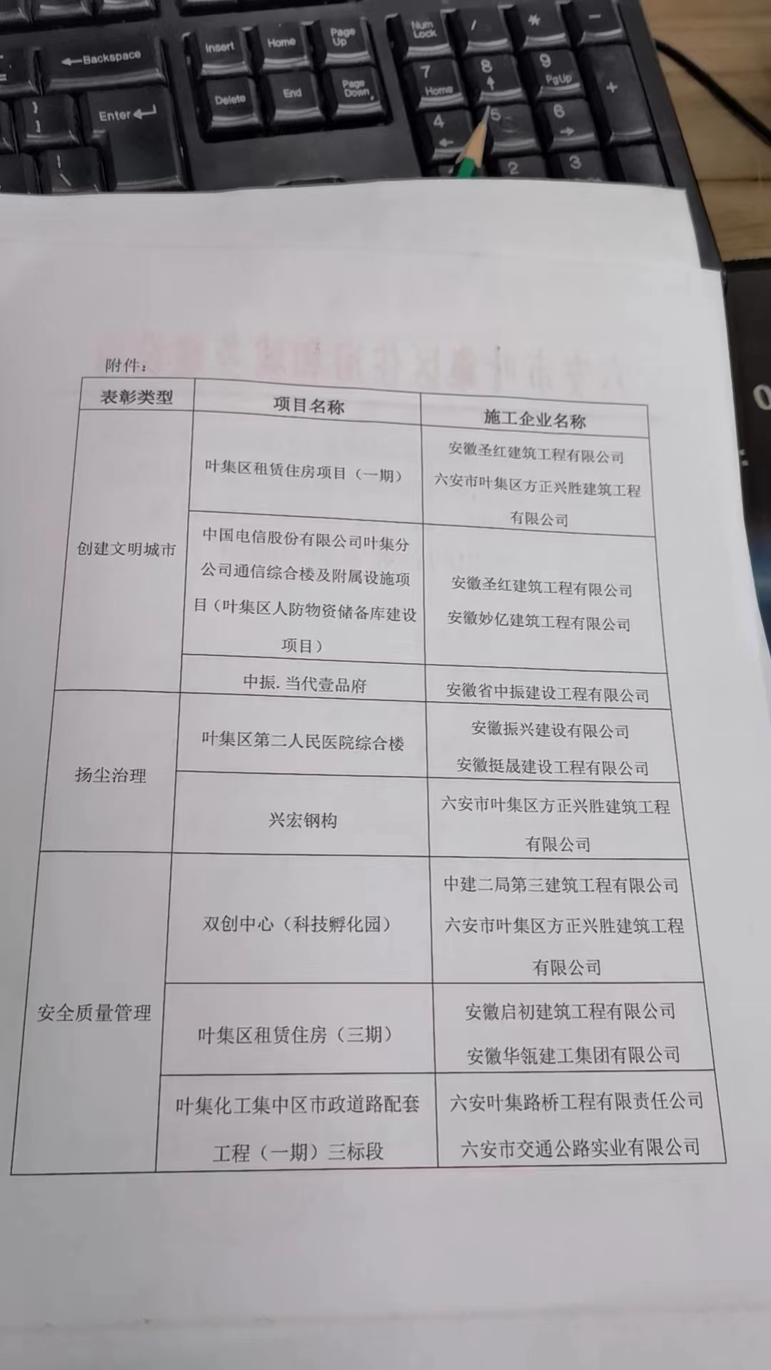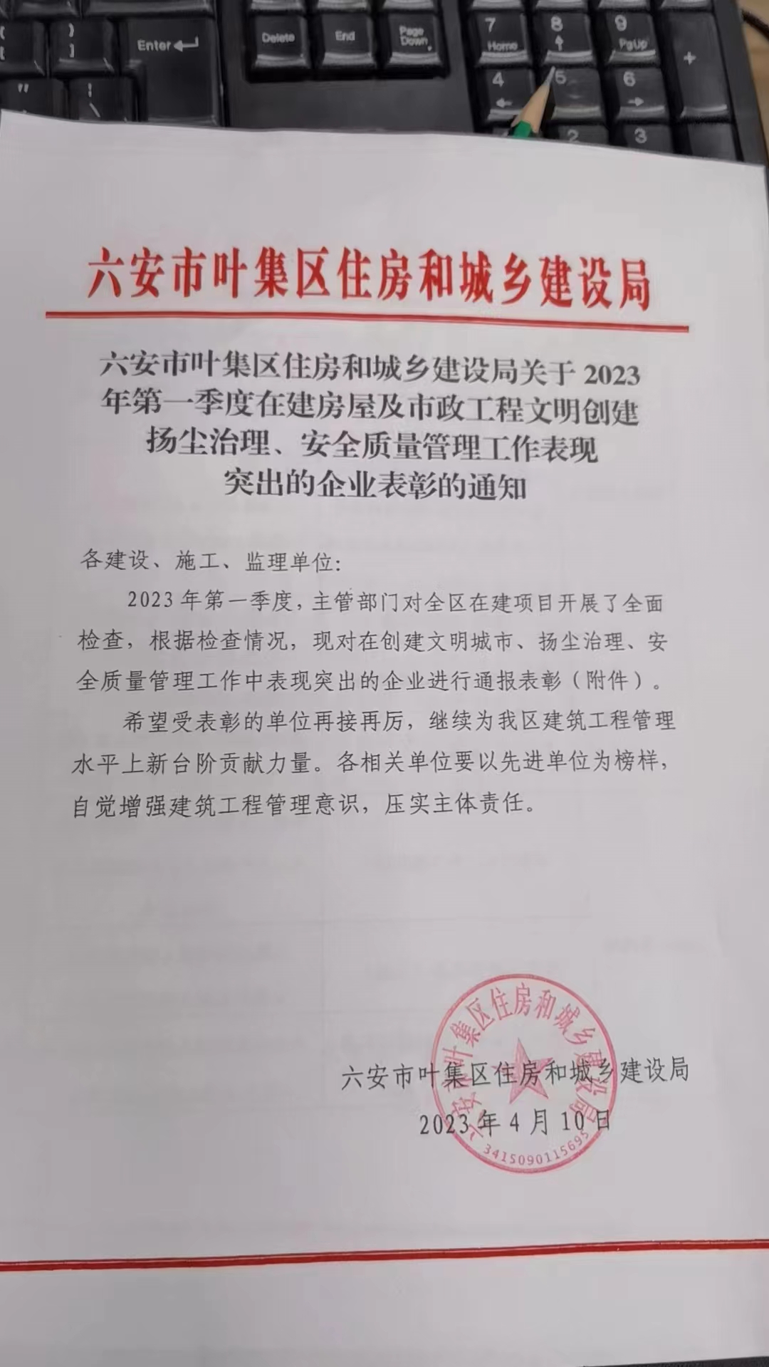 公司項目在葉集區住建局第一季度在建房屋檢查中被授予安全質量管理工作表現突出的表彰